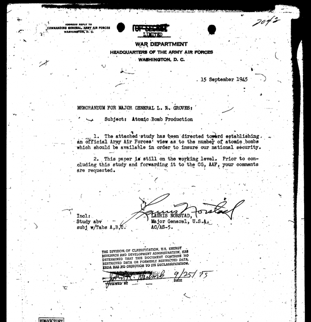 The Truman administration had not only endorsed the bombing of Hiroshima and Nagasaki ordered by the War Department in coordination with the Manhattan Project, the intent to wage a nuclear war against the Soviet Union was confirmed by secret classified documents of the War Department dated September 15, 1945.