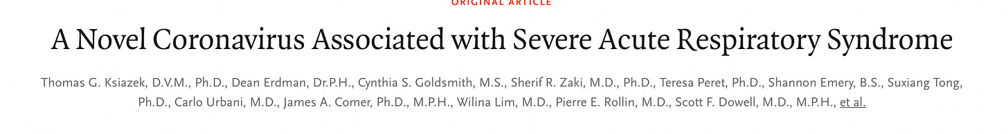 “A Novel Coronavirus Associated with Severe Acute Respiratory Syndrome”