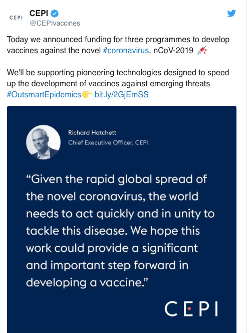 Proposed by the Coalition for Epidemic Preparedness Innovations (CEPI) an entity financed by the Bill and Melinda Gates Foundation, a 2019-nCoV vaccine program was put forth. Announced at Davos, Seattle-based Moderna (with the support of CEPI) was to manufacture an mRNA vaccine to build immunity against 2019-nCoV.