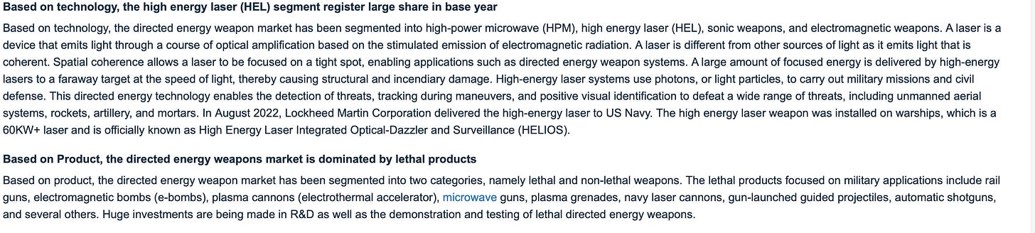 Directed Energy Weapons (DEW) constitute a buoyant $5.3 billion dollar business (2022) which is slated to increase to $12.9 billon dollars by 2027. This profit-driven military-industrial market is dominated by six “defense contractors” including Raytheon, Northrup Grunman, BAE Systems (plc), Boeing, Lockheed Martin and L3Harris Technologies.
