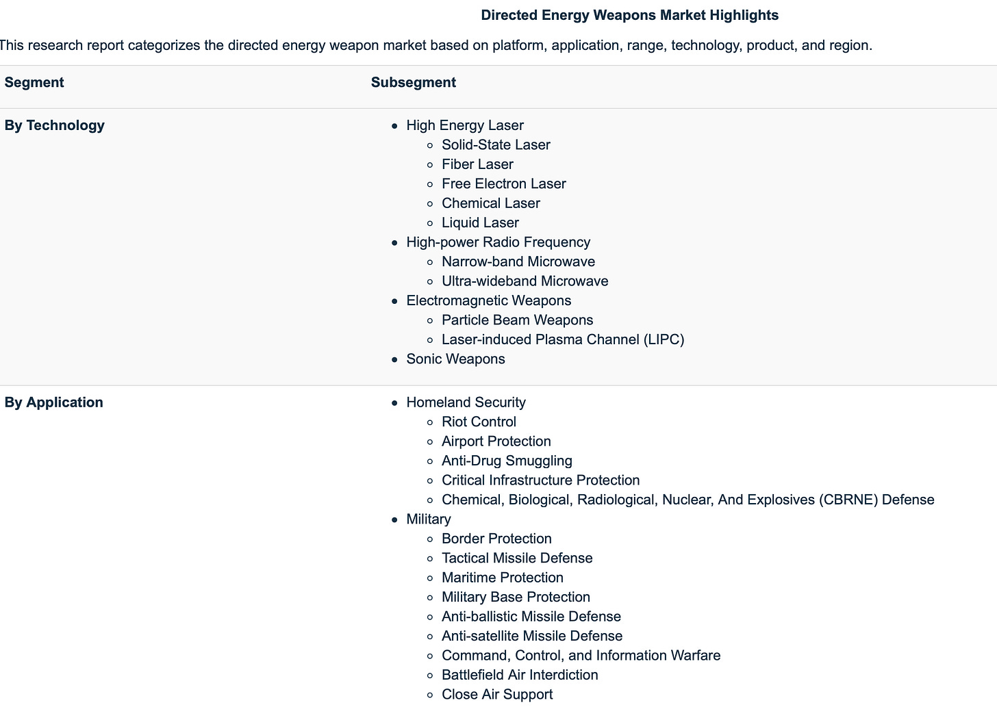Below is an examination of the Directed Energy Weapons Market by: Marketandmarkets.com