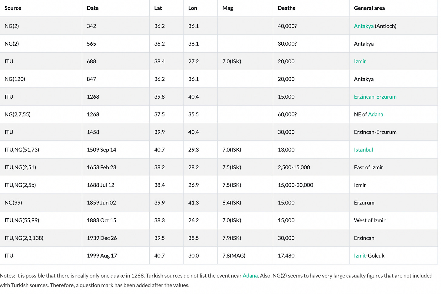 NG(n): R. Ganse and J. Nelson, Catalog of Significant Earthquakes 2000 BC – 1979 Including Quantitative Casualties and Damage, NOAA/NGDC Report SE-27, Boulder CO, 1981. The number in parentheses is from their references table, as listed below: