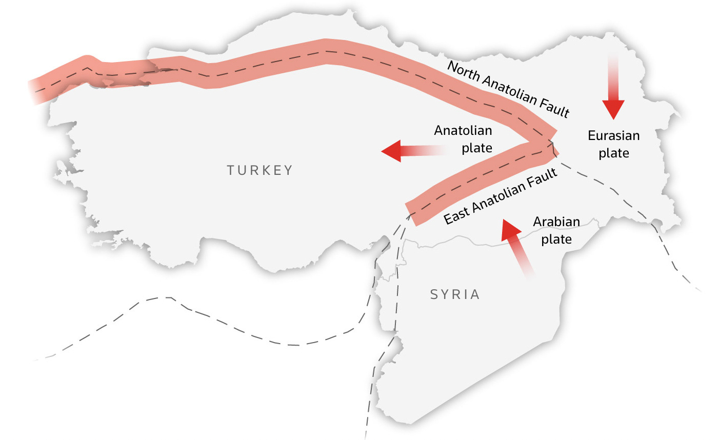 “earthquake activities mainly occur “on the Anatolian plate, a small wedge-shaped tectonic plate that is being squeezed westwards as the Arabian plate to the east slams into the Eurasian plate.“ (emphasis added)