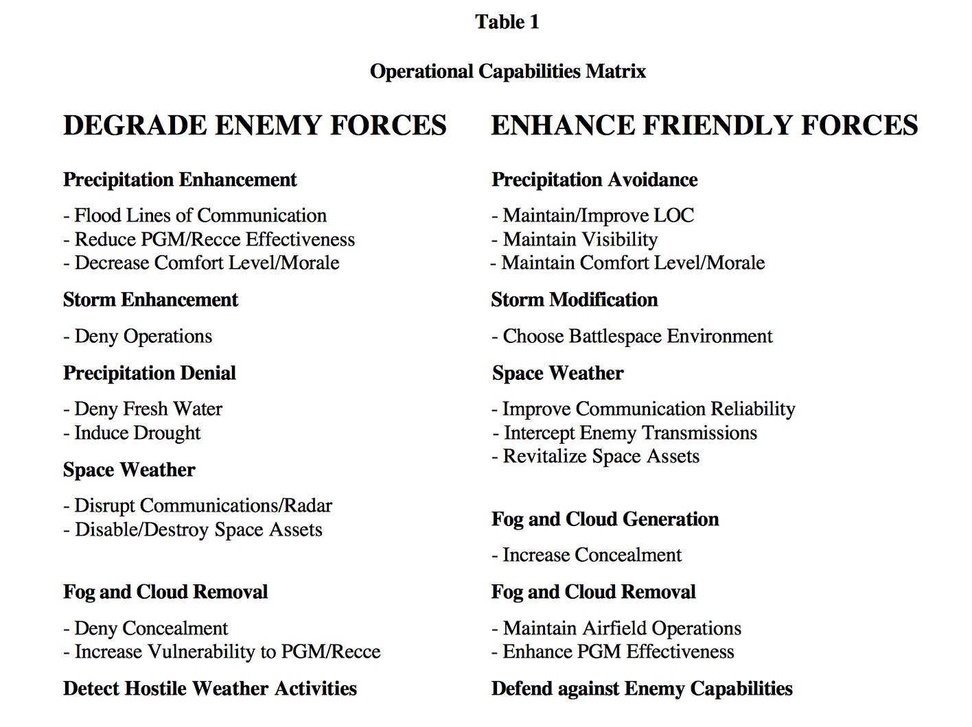 ….From enhancing friendly operations or disrupting those of the enemy via small-scale tailoring of natural weather patterns to complete dominance of global communications and counterspace control, weather-modification offers the war fighter a wide-range of possible options to defeat or coerce an adversary. Some of the potential capabilities a weather-modification system could provide to a war-fighting commander in chief (CINC) are listed in table 1.
