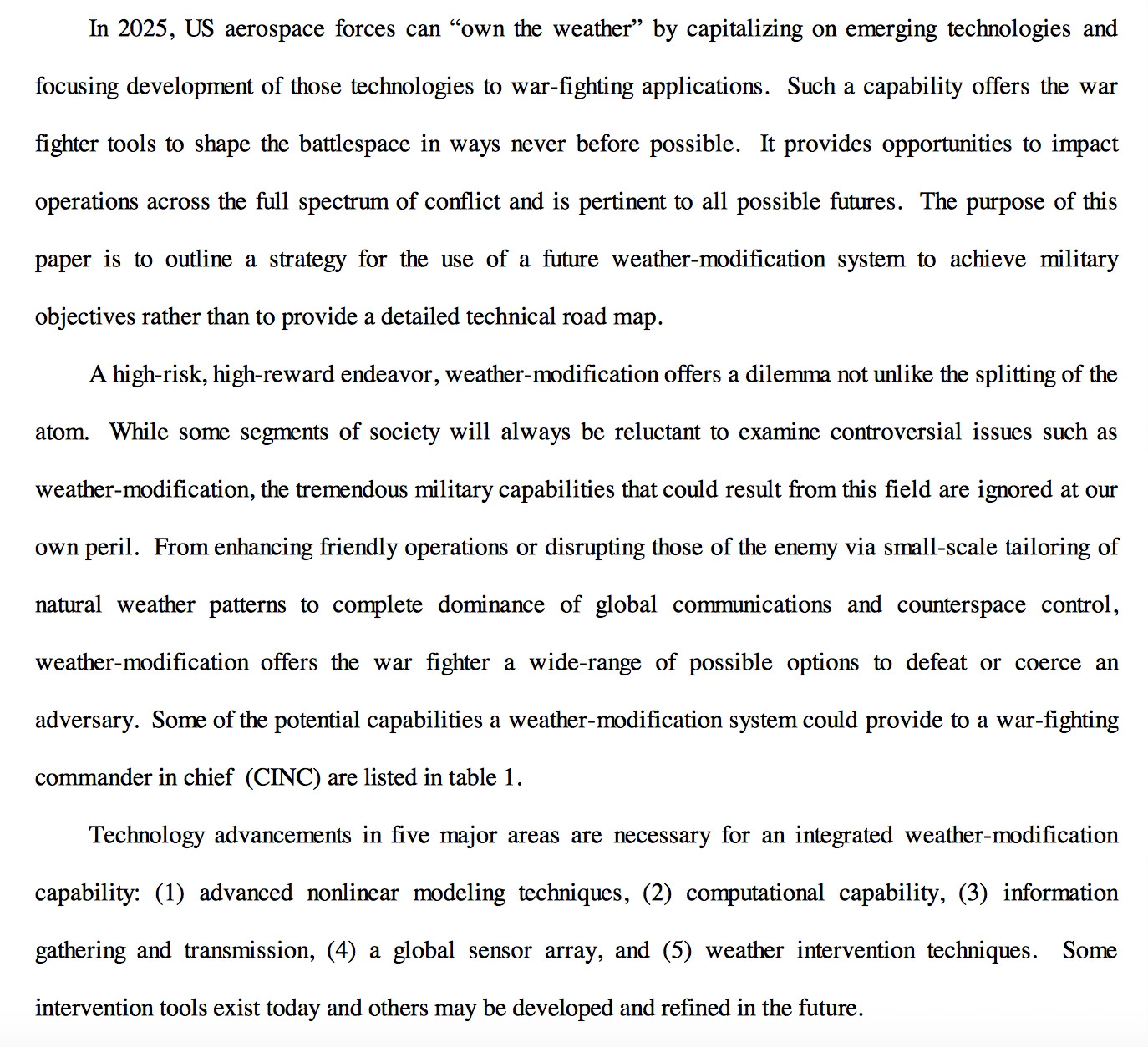 “[Weather modification] offers the war fighter a wide range of possible options to defeat or coerce an adversary… Weather modification will become a part of domestic and international security and could be done unilaterally… It could have offensive and defensive applications and even be used for deterrence purposes. The ability to generate precipitation, fog and storms on earth or to modify space weather… and the production of artificial weather all are a part of an integrated set of [military] technologies.” (US Air Force document AF 2025 Final Report)