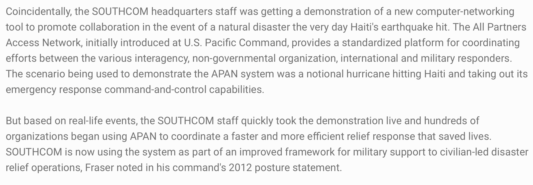 After the earthquake hit on Tuesday [January 12, 2010], Demay said SOUTHCOM decided to go live with the system. On Wednesday [January 13, 2010], DISA opened up its All Partners Access Network, supported by the Transnational Information Sharing Cooperation project, to any organization supporting Haiti relief efforts.