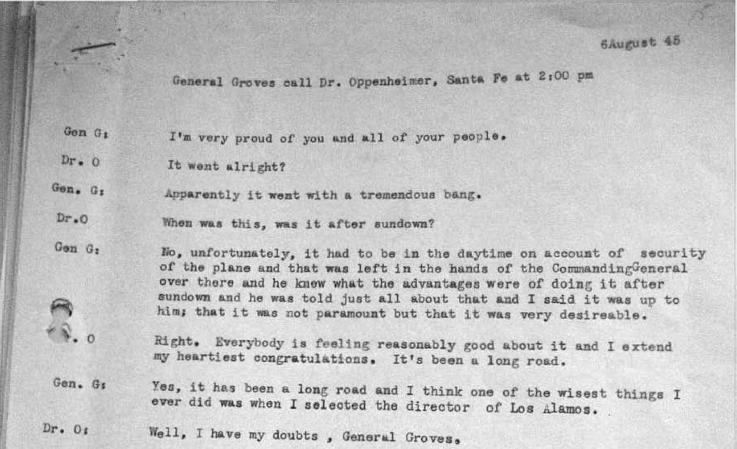 Below is the Transcript of an August 6, 1945 telephone conversation, declassified (between Gen. Groves and Dr. Oppenheimer) hours after the Hiroshima bombing: