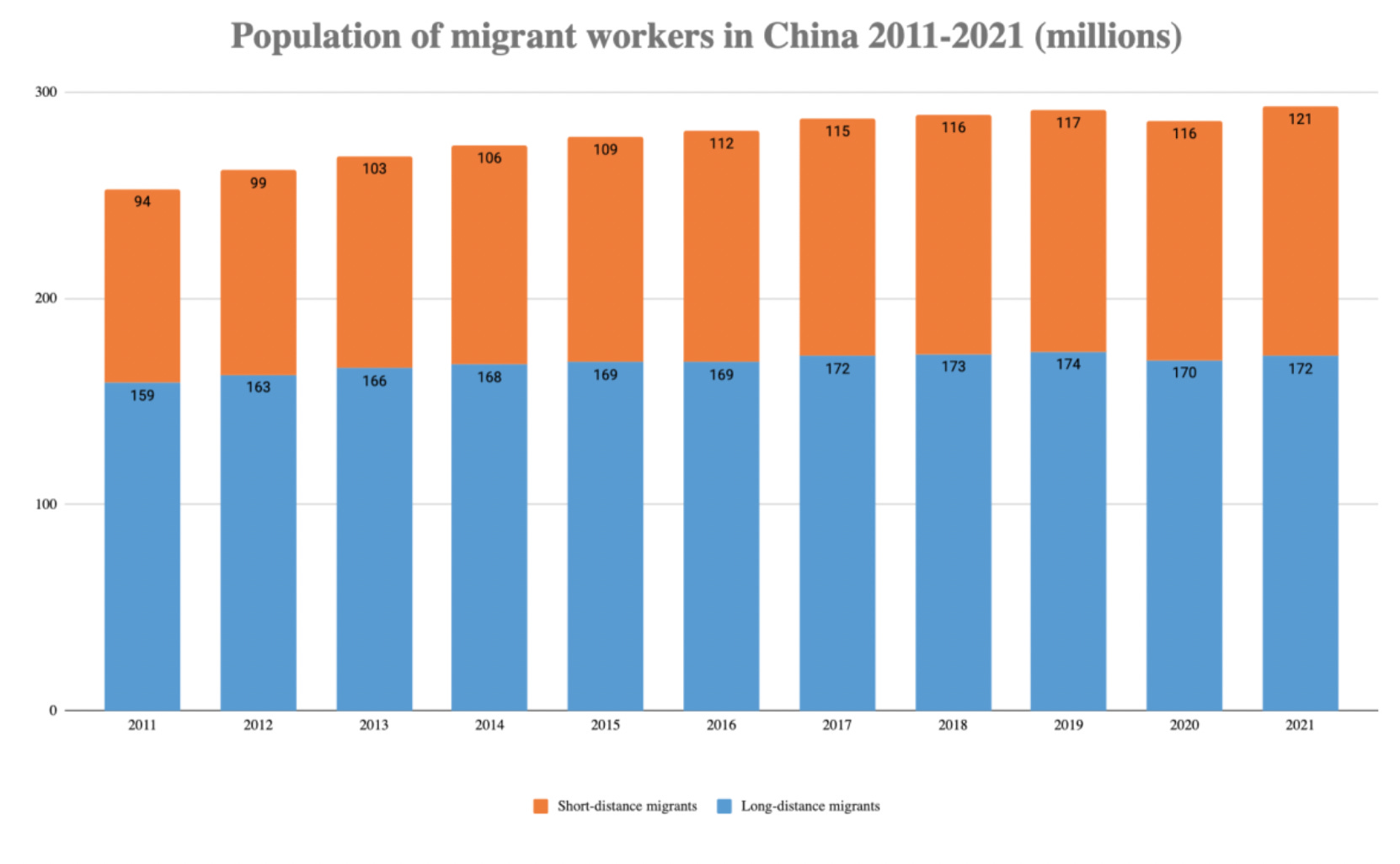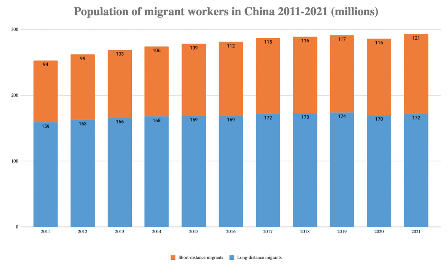 China has currently, according to official figures 292 million (2021) internal migrant workers employed in the cheap labor export economy, construction and infrastructure projects as well as in the urban services economy. 275 million (2015), 287 million (2017)