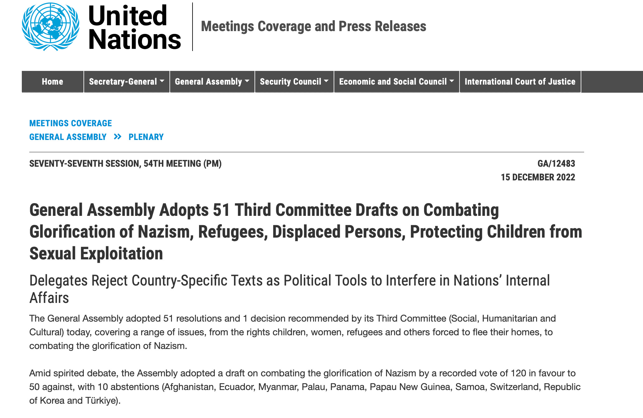 In a far-reaching initiative the UN General Assembly adopted a resolution on the “Glorification of Nazism.”