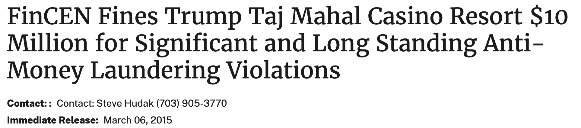 In contrast, amply documented: Trump’s Taj Mahal Atlantic City Casino was known as a convenient “vehicle for money laundering, with a significant amount of the illicit funds tied to narcotics trafficking.”