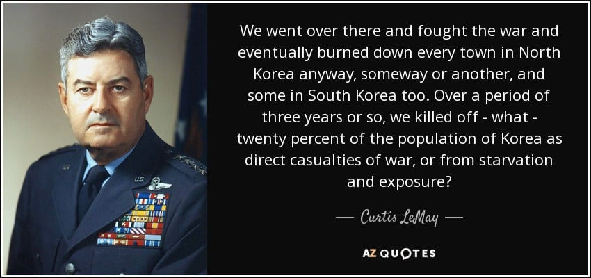 “After destroying North Korea’s 78 cities and thousands of her villages, and killing countless numbers of her civilians, [General] LeMay remarked,