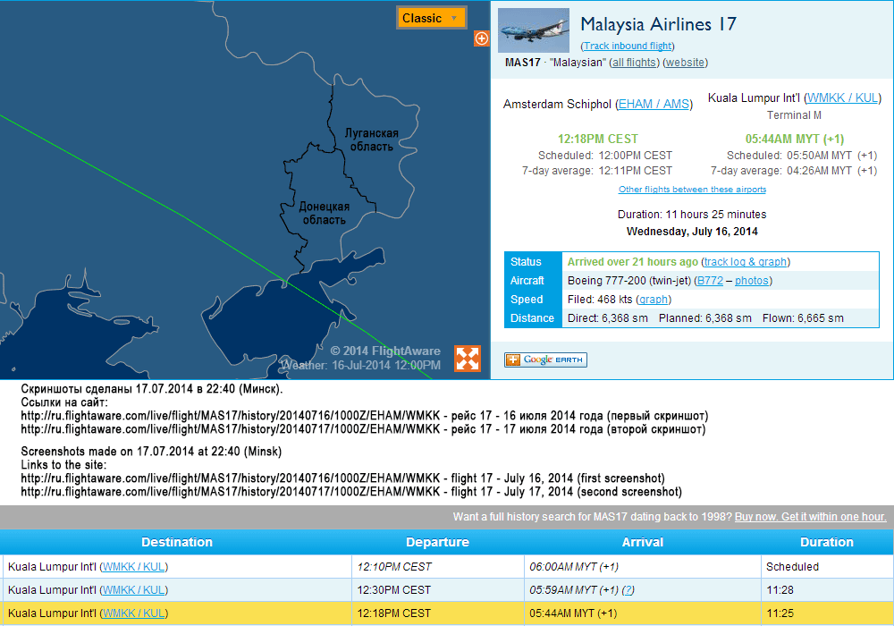 According to the official Ukrainian data, June 17, 2014, at the mentioned time two regular international flights were operating over the territory of Ukraine following the filed requests for aircraft clearance – MAS17 plane of the Malaysia Airlines and AFL-2074 one of Aeroflot.