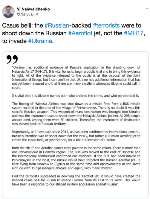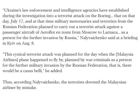 “Ukraine’s law enforcement and intelligence agencies have established during the investigation into a terrorist attack on the Boeing… that on that day, July 17, and at that time military mercenaries and terrorists from the Russian Federation planned to carry out a terrorist attack against a passenger aircraft of Aeroflot en route from Moscow to Larnaca… as a pretext for the further invasion by Russia,”