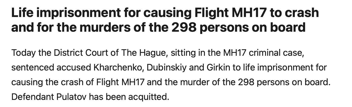 In November 2022, a Netherlands Court found the Kremlin responsible for the alleged attack: two Russians and a “separatist Ukrainian” were identified as “guilty of mass murder for their involvement in the downing of Malaysia Airlines Flight 17”.