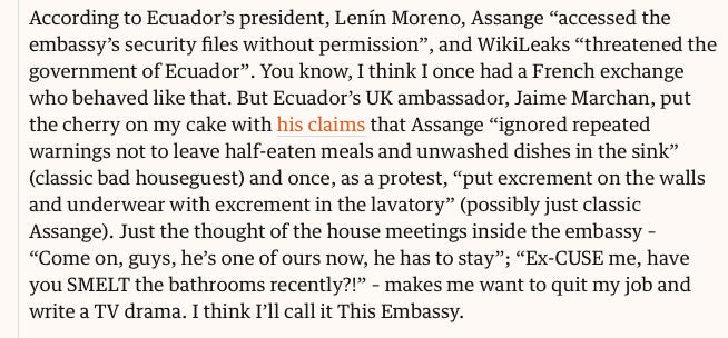 And then The Guardian, (April 20) with which Assange actively collaborated goes into a high-gear smear operation and character assassination: “cheap journalism” by the Guardian (read excerpt below):