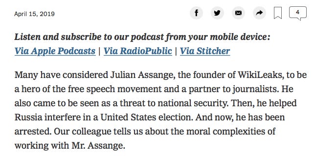 The latest from the New York Times April 15, 2019, which previously collaborated with Assange, describes him as a threat to National Security, working on behalf of the Russians.